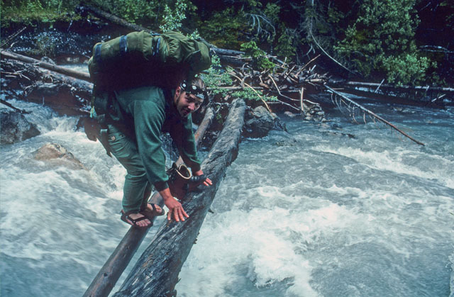 Bushwacking ins Fraser-Tal hinunter. Über hunderte von Metern heißt es über Stämme zu steigen oder …