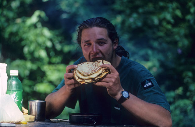 Kurze Stille. Wir haben schon viele Bärenbegegnungen durchgespielt. Immer wieder fordern wir uns während des Wanderns gegenseitig heraus. Etwa so: „Arni! Da vorn – fünf Meter bis zum Felsen – dahinter Grizzly mit zwei Jungen – hier der Baum mit Ästen, die fast bis zum Boden reichen – Was machst Du? Klettern oder Totstellen?“