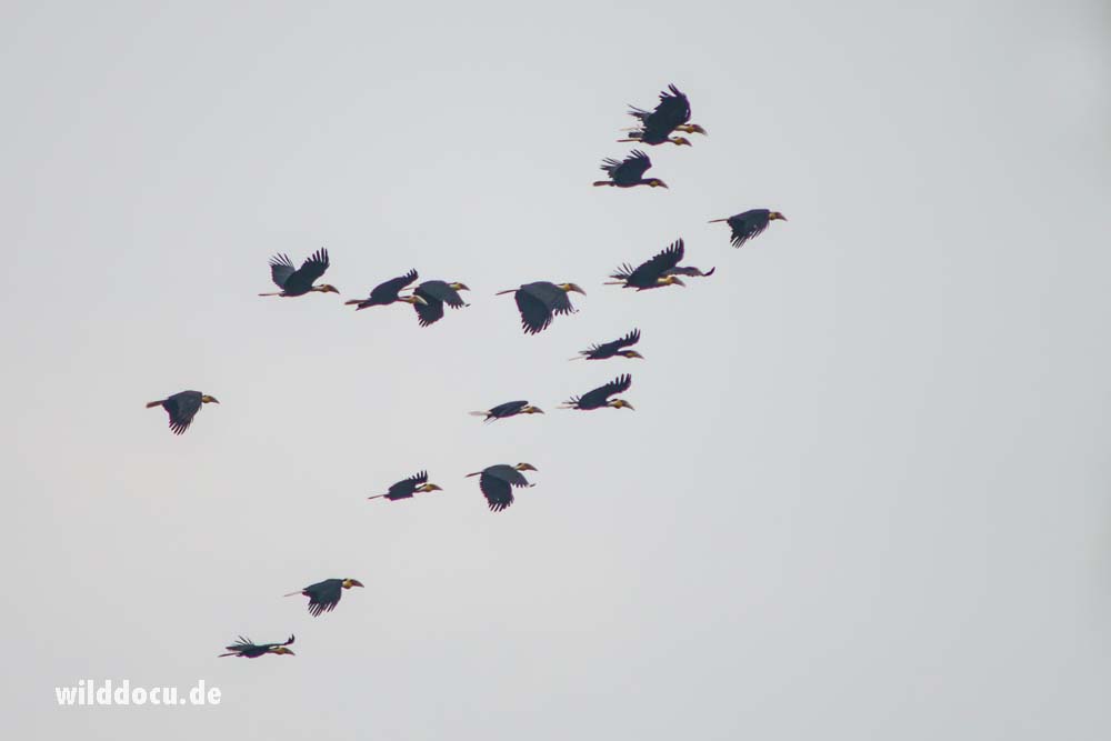 One of the greatest sights of the trip: 18 Wreathed Hornbills in flight. On closer inspection I find out that two of them are males, the other 16 are juveniles (recognizable by their smaller bill). I know of large group compositions in hornbills, but two male adults going on a trip with a bunch of youngsters – what is this?